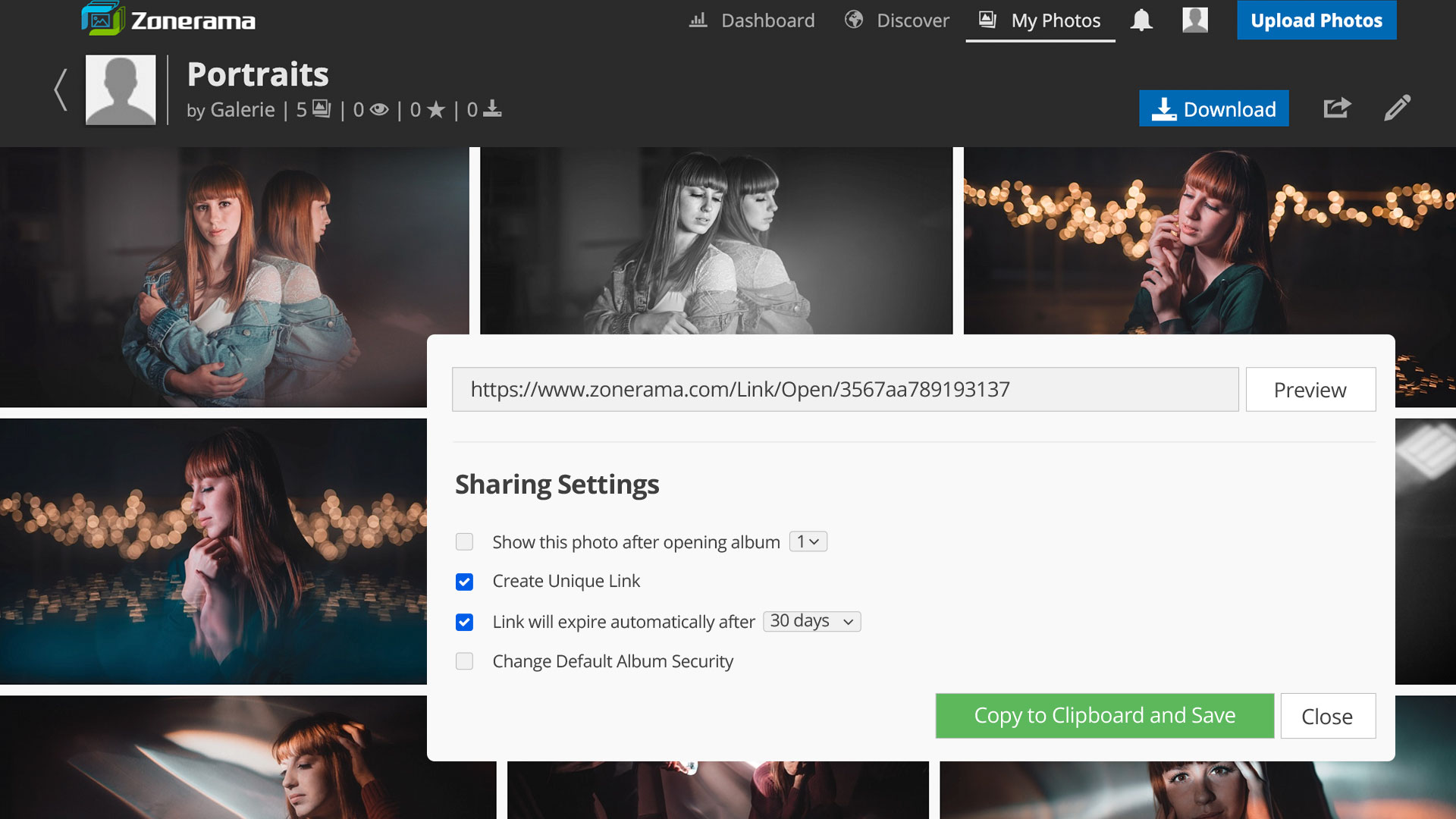 Share your albums, photos, or videos directly on social media. Or create links, give them expiration dates, and send them however you want—for example by email.